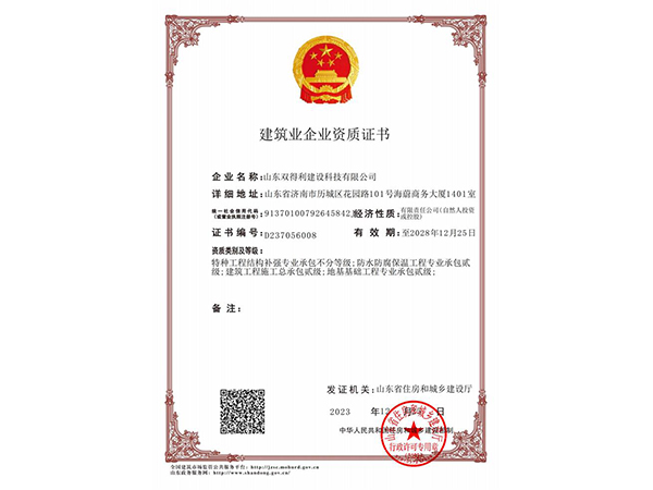 山東雙得利建設科技有限公司是一家集科研、工程技術開發、咨詢、工程結構加固改造檢測、設計、施工于一體的綜合性、專業化企業。公司注冊資金5001萬元,具備建筑工程施工總承包貳級、主體結構工程檢測、特種工程結構補強專業承包不分等級、地基基礎工程專業承包貳級、防水防腐保溫工程專業承包貳級、施工勞務不分等級資質?,F有高素質人才126人,其中高級工程師6人,一級注冊結構工程師2人,一級注冊建造師3人,一級注冊造價師2人,注冊監理工程師2人,二級注冊結構工程師4人,二級注冊建造師10人,中級工程師30余人,其他專業技術人員30余人。公司所有工程技術人員均從事工程施工行業多年。
